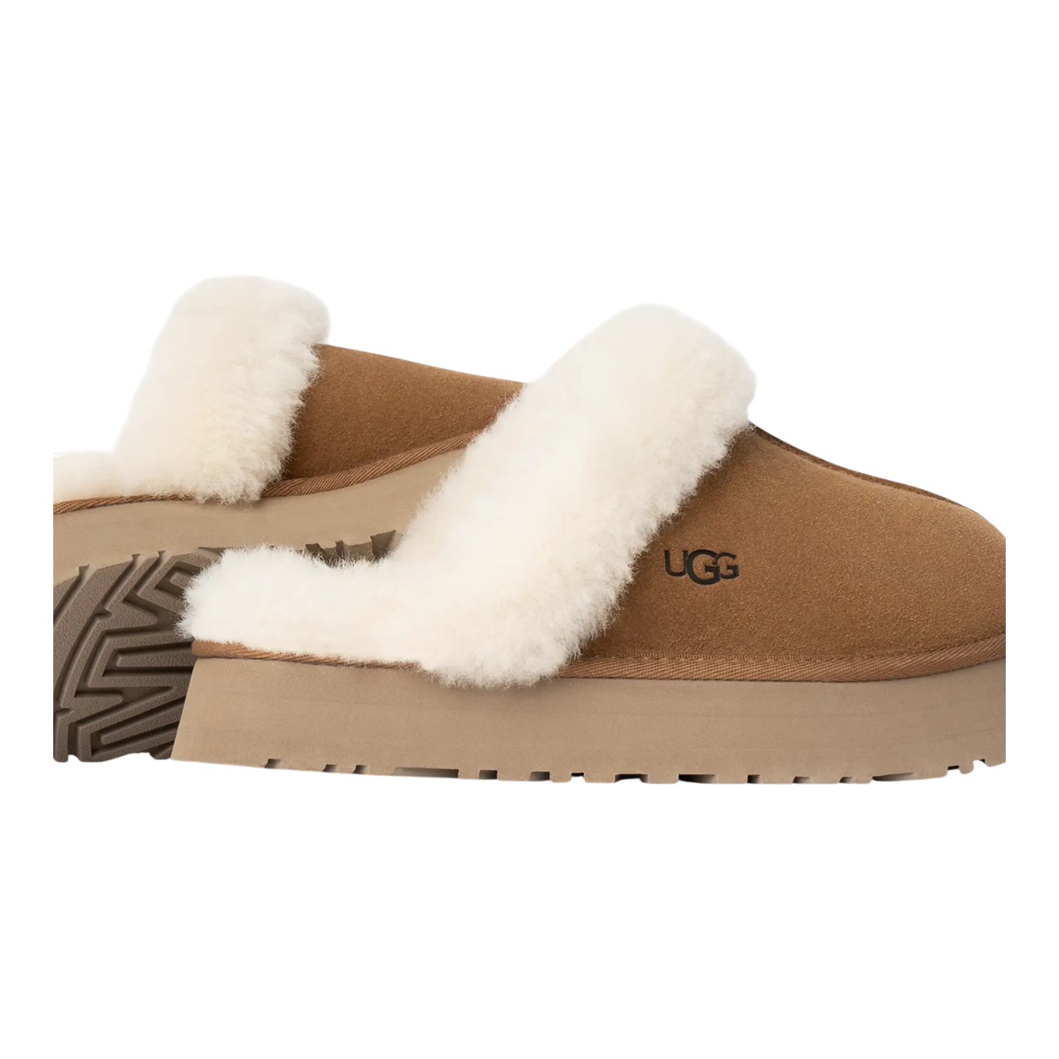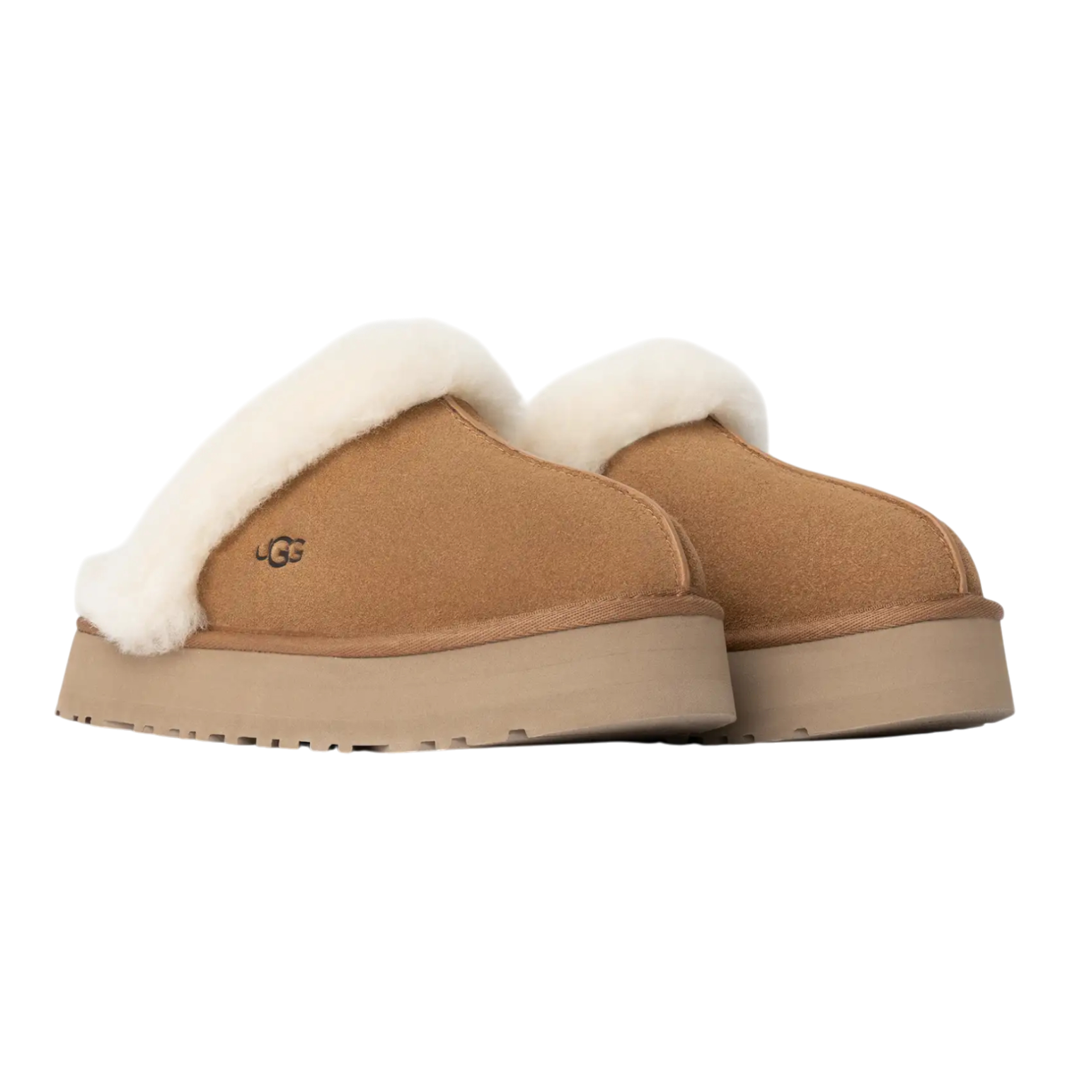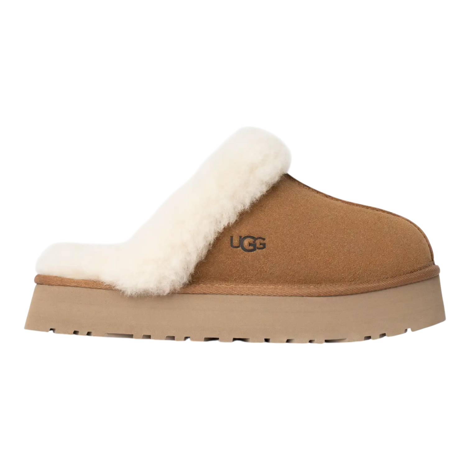 The UGG Disquette brings bold personality and plush comfort together in one statement-making silhouette. With a retro-inspired 1” platform sole and slip-on design, this standout style is crafted from signature sheepskin and soft suede for an ultra-cozy feel inside and out. Designed for outdoor wear, it features a cushioned midsole and either a sustainable sugarcane EVA or Treadlite by UGG™ outsole for lightweight support. Finished with recycled textile binding and made in a factory that supports women’s empowerment, the Disquette adds playful, confident flair to any look.