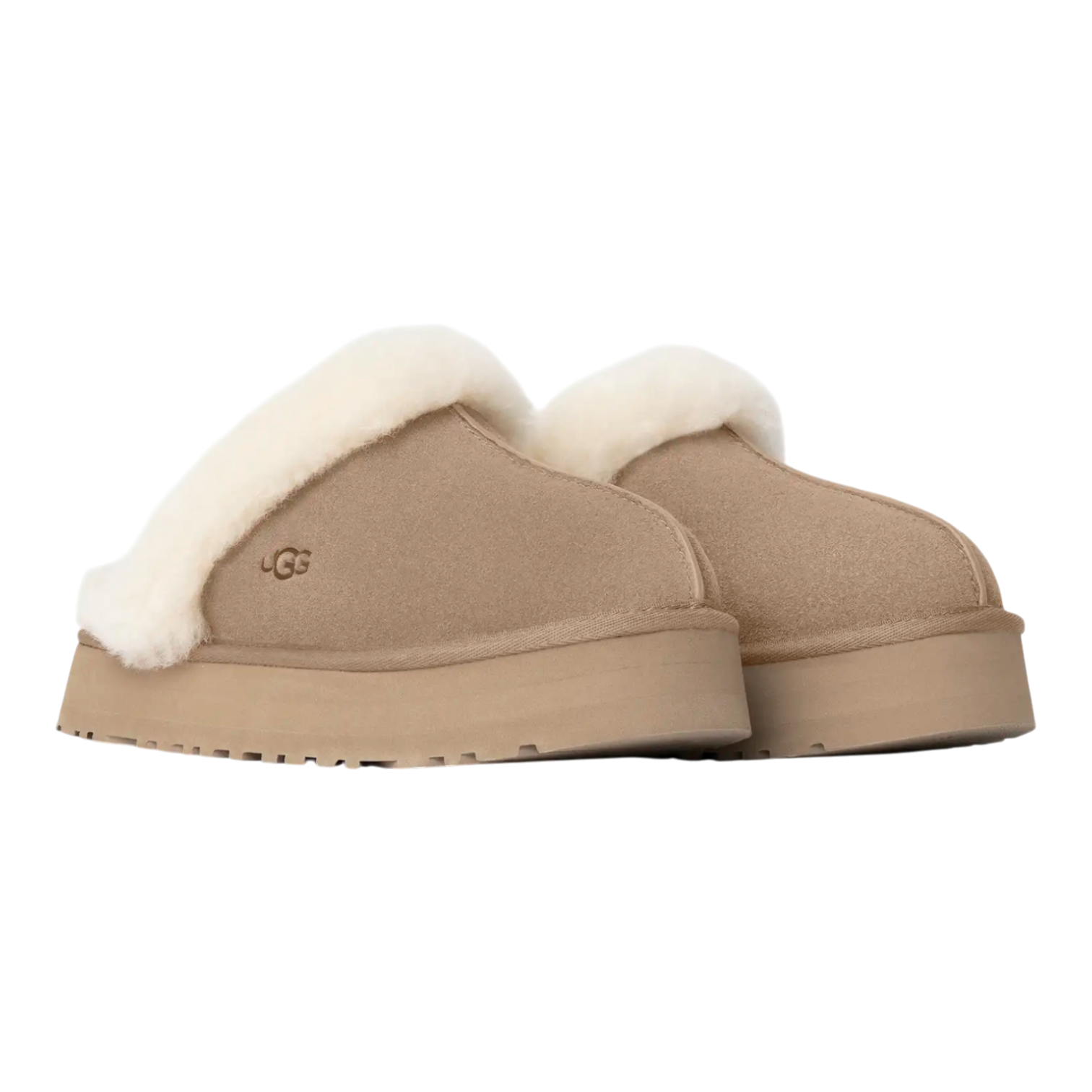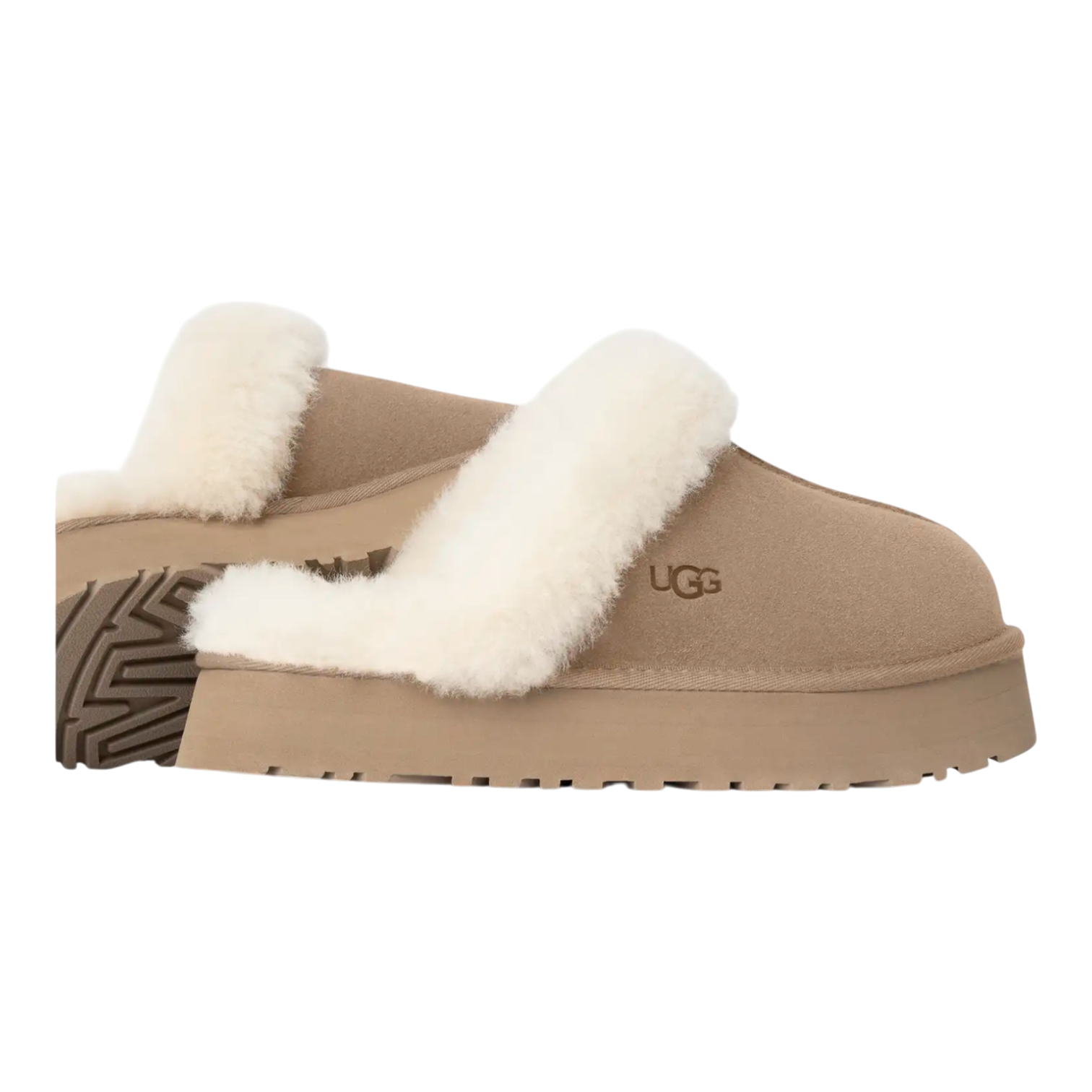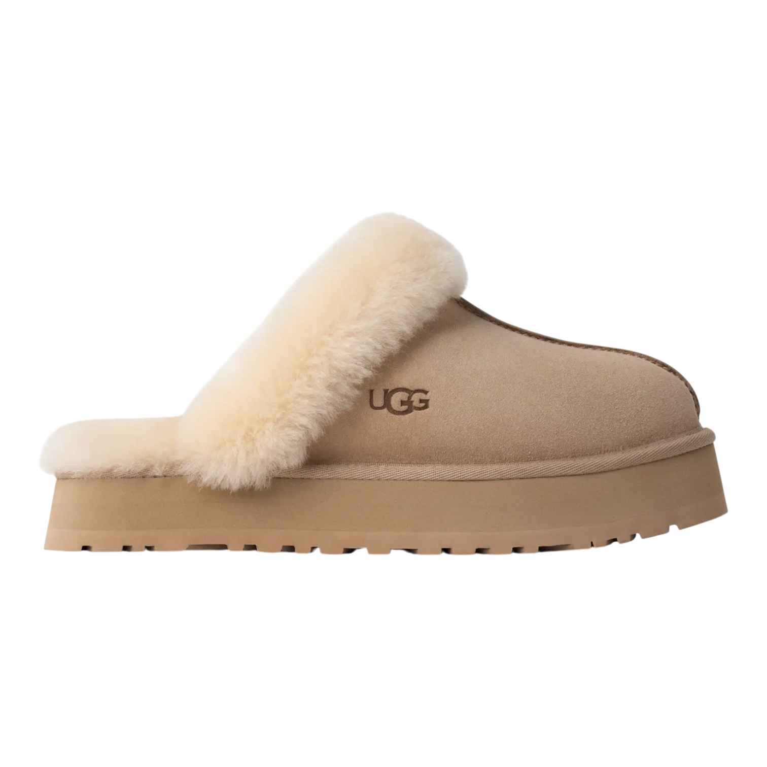 The UGG Disquette brings bold personality and plush comfort together in one statement-making silhouette. With a retro-inspired 1” platform sole and slip-on design, this standout style is crafted from signature sheepskin and soft suede for an ultra-cozy feel inside and out. Designed for outdoor wear, it features a cushioned midsole and either a sustainable sugarcane EVA or Treadlite by UGG™ outsole for lightweight support. Finished with recycled textile binding and made in a factory that supports women’s empowerment, the Disquette adds playful, confident flair to any look.