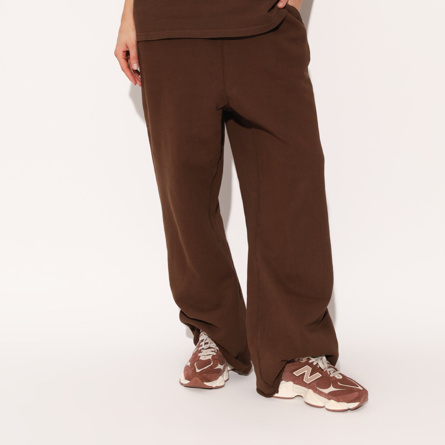 New Balance 9060 Rich Oak Timberwolf sneakers worn with brown wide-leg pants.