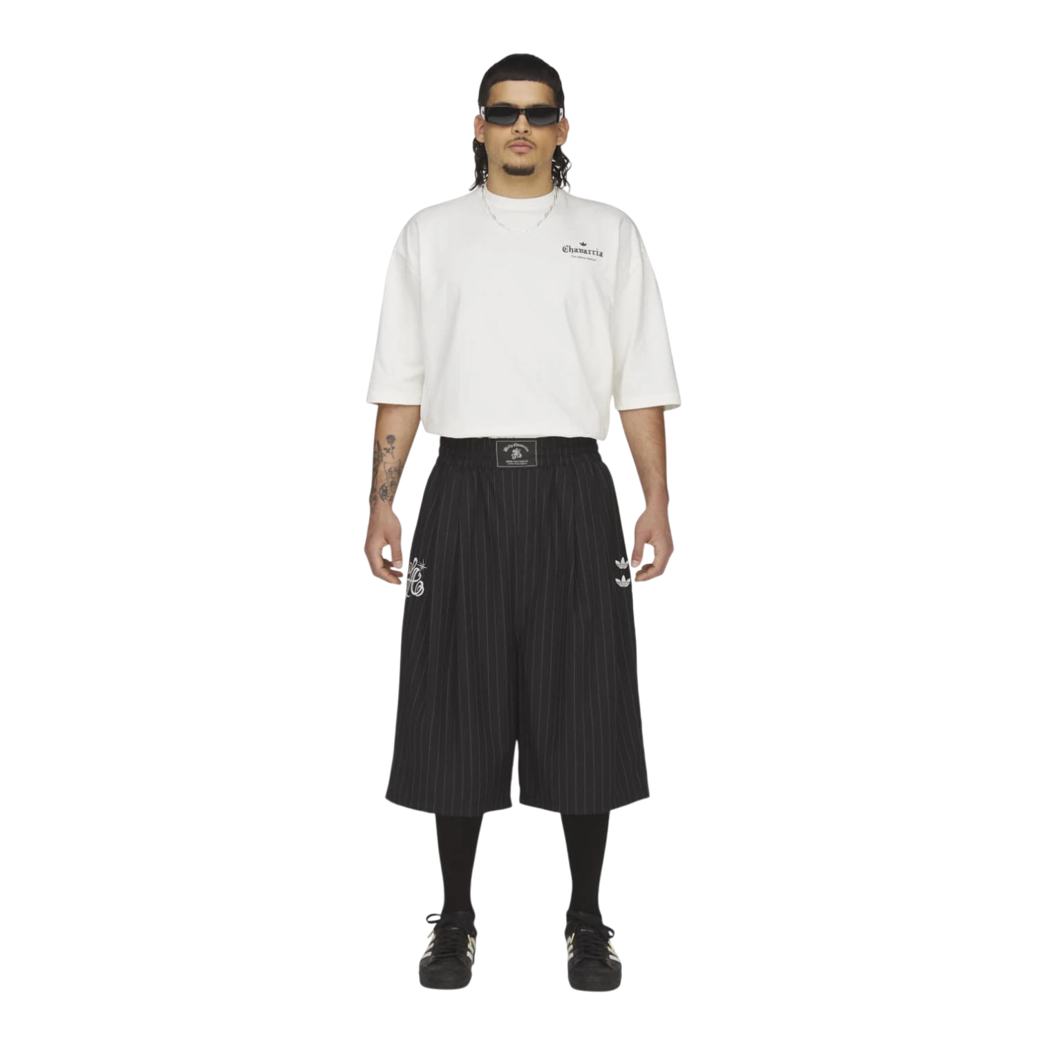 A modern short combining oversized proportions, pinstripe detailing, and elevated streetwear design.