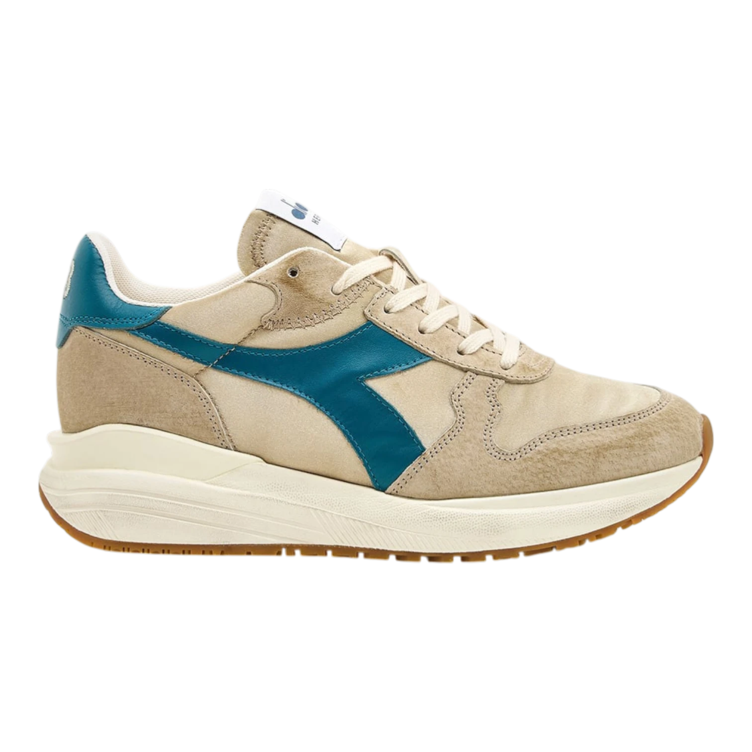 Crafted from precious satin textile with pigskin nubuck and lightly waxed leather details, the upper delivers a luxurious feel with subtle depth. Signature elements such as the hand-stitched logo, crochet detailing, and stone-wash effects highlight Diadora’s attention to artisanal detail.