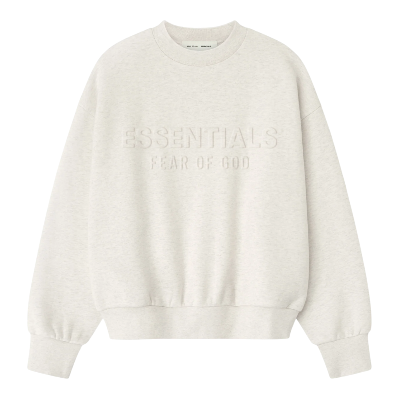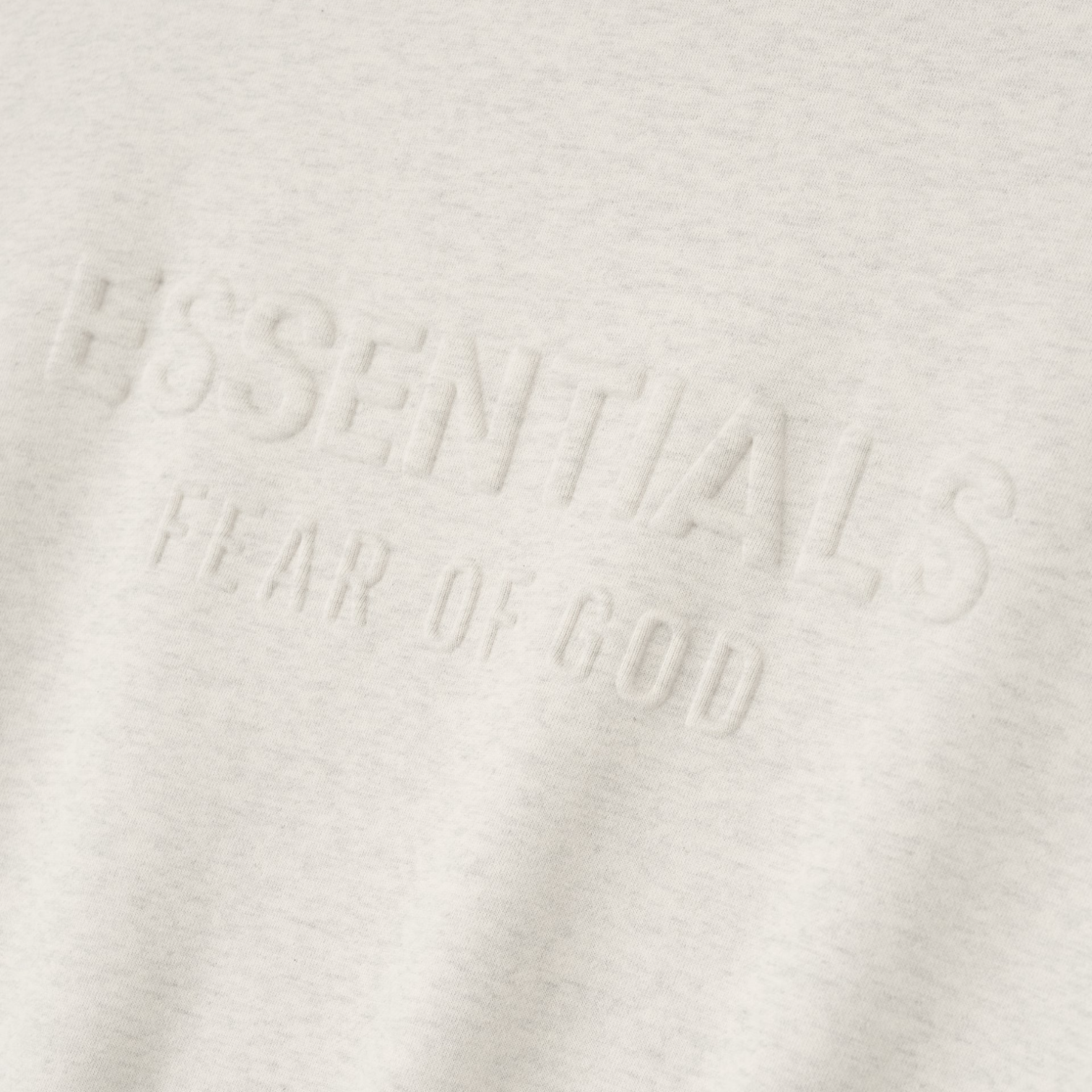 Close-up of the Fear of God Essentials Classic Crewneck showing embossed logo in Oatmeal Heather color.