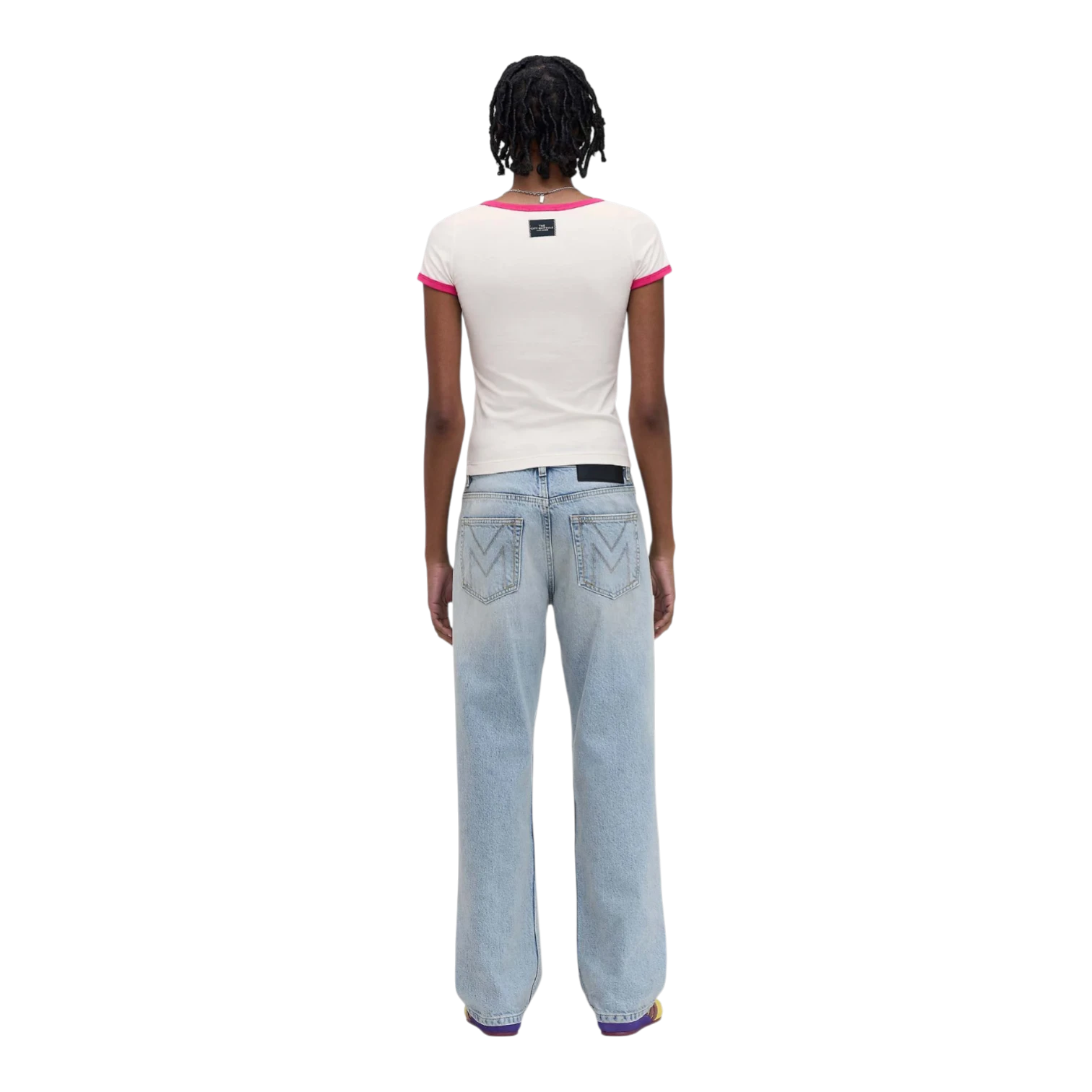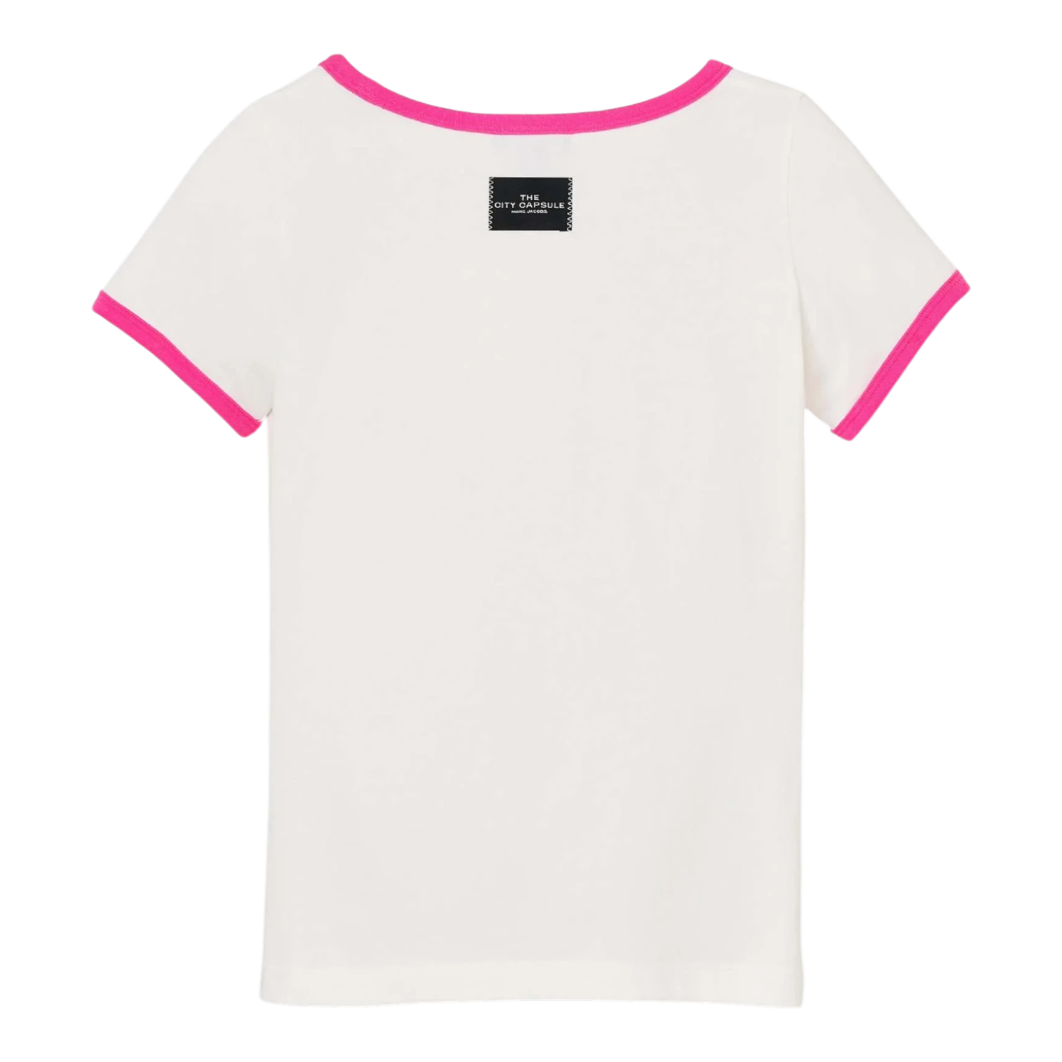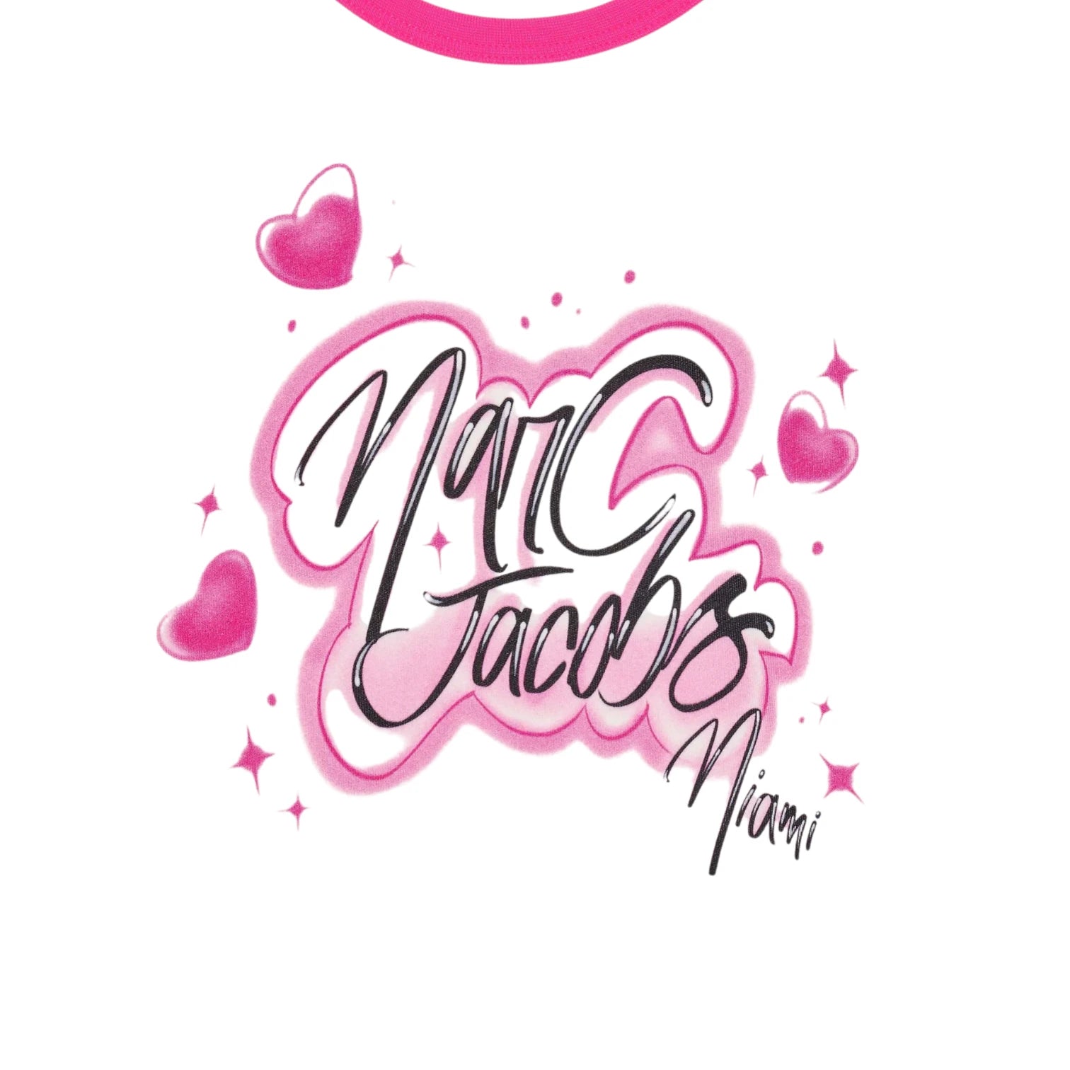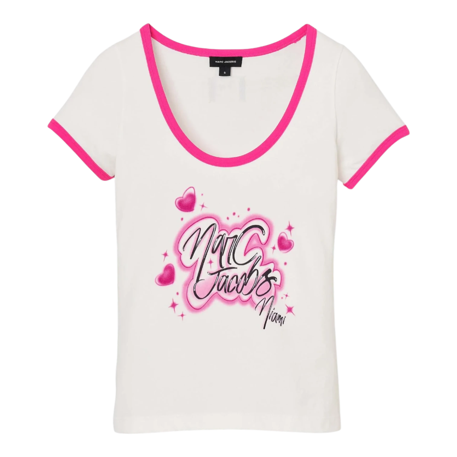Part of the limited-edition City Capsule collection, this Miami-inspired tee from Marc Jacobs captures the vibrant energy of the boardwalk with a custom airbrushed Marc Jacobs Miami logo in true retro style. Crafted from a soft, breathable cotton blend with added stretch (96% cotton, 4% spandex), this t-shirt offers a comfortable, flattering fit enhanced by a feminine scooped neckline. Playful pink contrast detailing at the neck and cuffs adds a bold, standout touch, while the woven City Capsule label at the back completes the signature branded finish. Perfect for styling with denim or casual separates, this limited-edition graphic tee blends nostalgic flair with modern streetwear appeal.